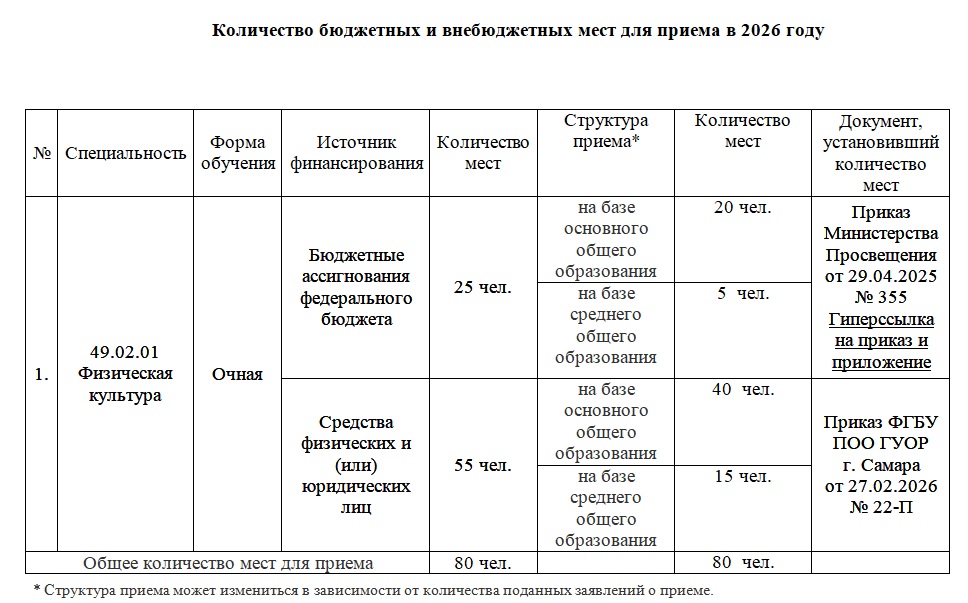 Количество бюджетных и внебюджетных мест для приема в 2026 году