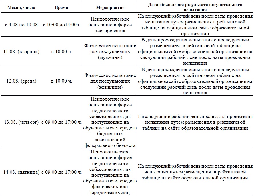 Вступительные испытания проводятся с 4 по 14 августа 2026 года, по графику :
